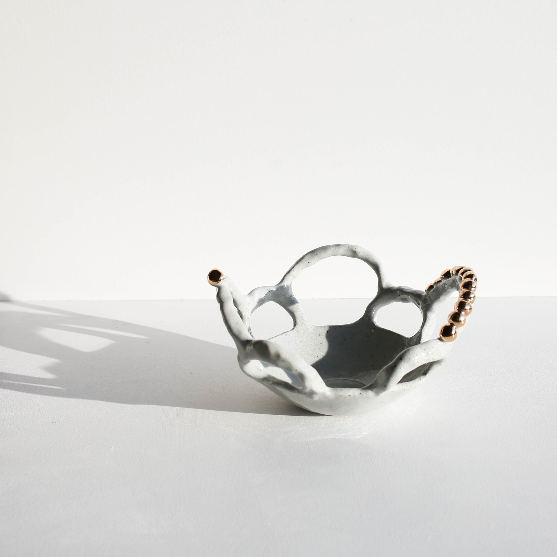 What makes it stand out? Subtle gold pearl accents that add just the right amount of sparkle. It’s a functional piece with a creative twist—great for holding fruit, or just looking good on its own.