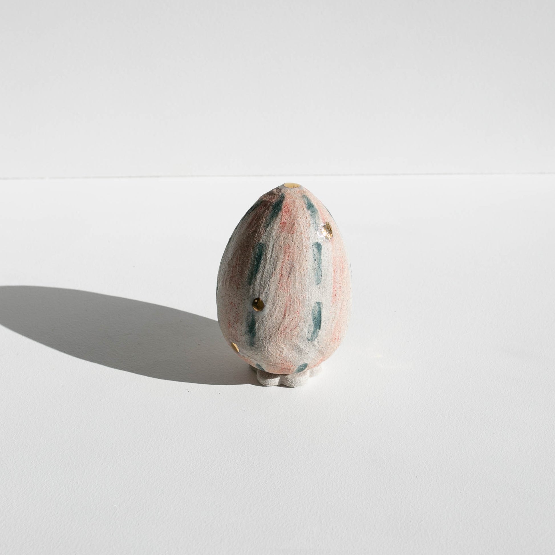 Handmade stoneware ceramic egg, painted with joyful designs and adorned with shimmering gold accents, exudes a timeless elegance.